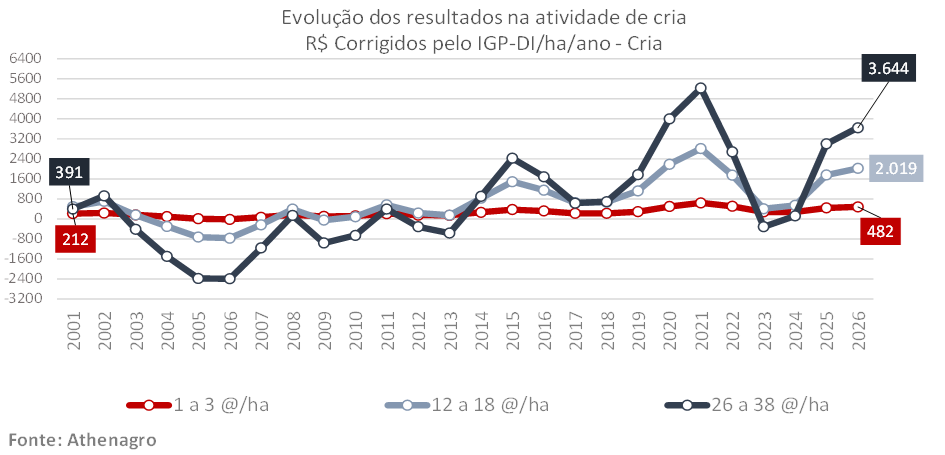 Antes que o mercado se ajustasse, a atividade de cria em altas tecnologias era proibitiva. Simulações de resultados que seriam obtidos mostram longos anos de prejuízos nos modelos mais produtivos. Importante ressaltar que níveis tecnológicos mais altos, conforme exposto no gráfico, são raros na atividade de cria, exclusivamente. Para fazer a análise a partir de casos reais, a Athenagro usa informações originadas nas fazendas de ciclo completo.