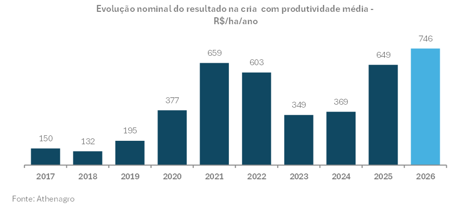 Fazendas que operam com desempenho comercial, de acordo com o critério adotado pela Athenagro, devem obter resultados de R$1.000/ha em 2026, com produtividades próximas a 7,8@/ha/ano. O que acontecerá com a área de cria, ou com a produção, se os produtores brasileiros se esforçarem para aumentar apenas R$250/ha nos resultados anuais?